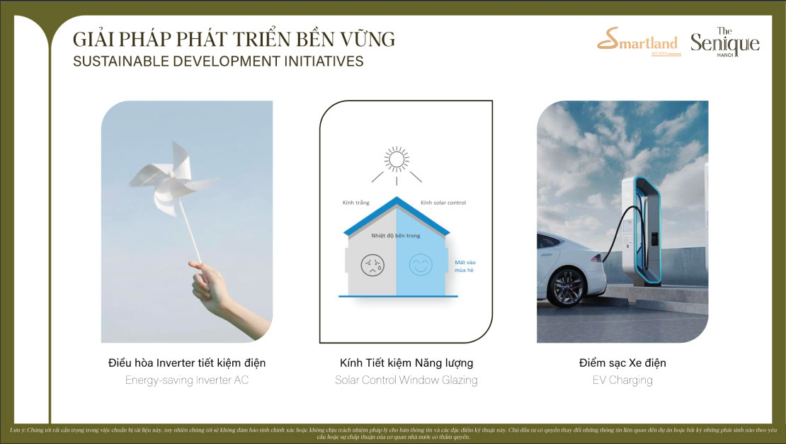 Tiết kiệm năng lượng - phát triển bền vững: Cam kết phát triển bền vững của CLD được thể hiện qua thiết kế tinh tế và các tính năng sáng tạo của The Senique Hanoi. Dự án dự kiến tiết kiệm năng lượng lên tới 24% và đặt mục tiêu đạt chứng nhận EDGE do Tổ chức Tài chính Quốc tế (IFC) cấp. Dự án còn tích hợp các tính năng bền vững khác như hệ thống thu nước mưa, đa dạng cây xanh và sử dụng vật liệu địa phương.